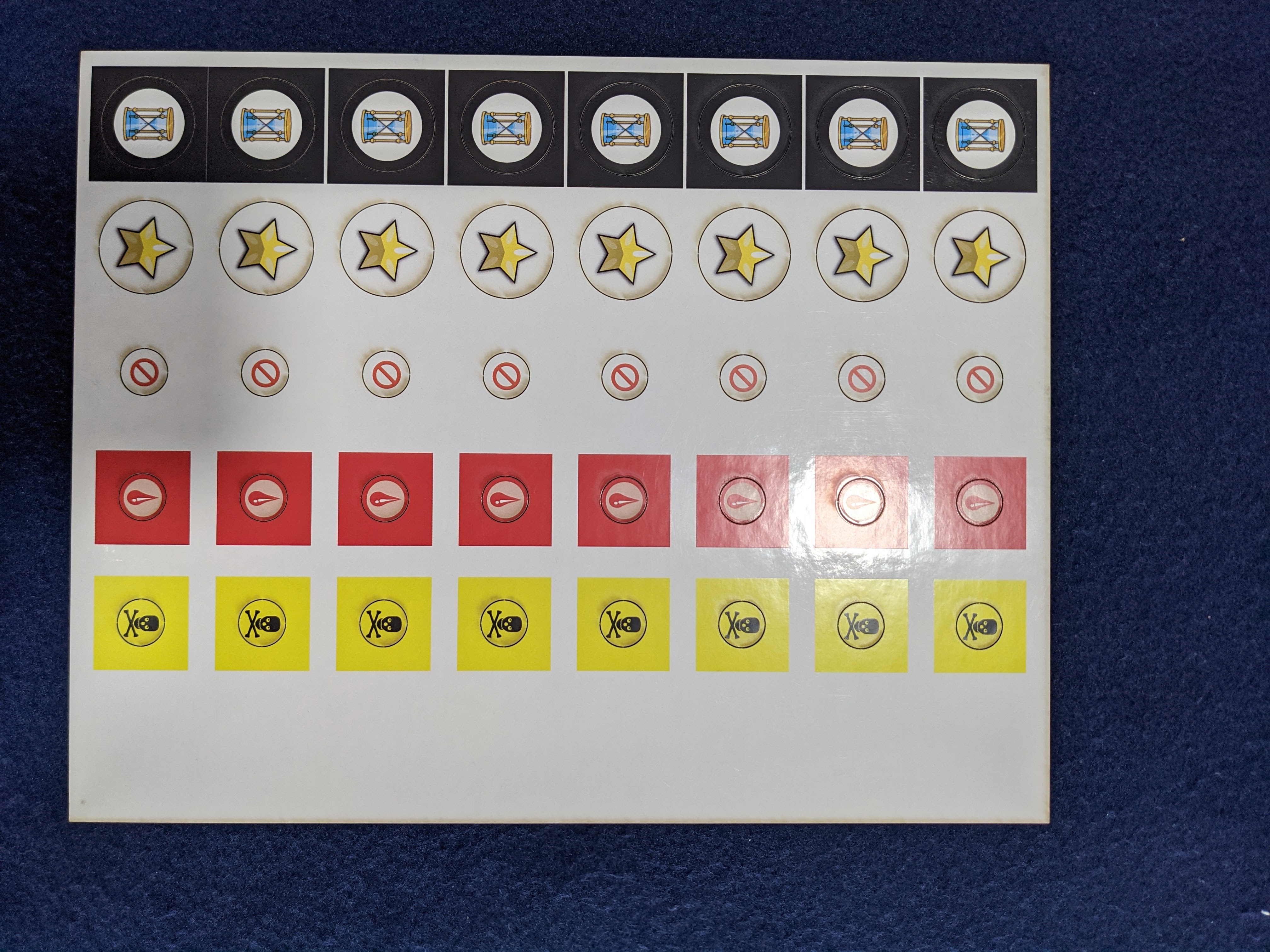 | These are the ROF and Suppression markers. At the right these are double-sided with the top ones being ROF. Those are placed and then are flipped to the bottom image to represent Suppression. |